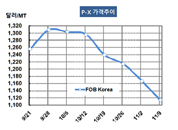 P-X(Para-Xylene)는 1100달러가 붕괴될 위기에 처했다. P-X 시세는 11월9일 FOB Korea 톤당 1113달러로 54달러 폭락했고 CFR SE Asia는 1120달러로 54달러 떨어졌다. CFR China 역시 1133달러로 54달러 폭락했다. 표, 그래프: <P-X 가격추이> <화학저널 2018/11/15> |