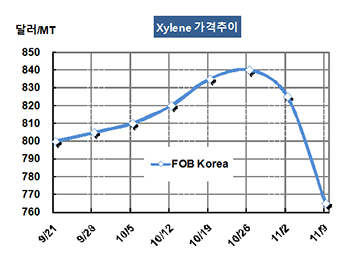 M-X(Mixed-Xylene)는 모노머 중 마지막으로 폭락했다. M-X 시세는 11월9일 솔벤트(Solvent) 그레이드 기준 FOB Korea 톤당 765달러로 60달러 폭락했으나 CFR SE Asia는 830달러로 40달러 급락했다. CFR China는 775달러로 70달러 폭락했으나 CFR India는 840달러로 35달러 하락에 머물렀다. 표, 그래프: <Xylene 가격추이> <화학저널 2018/11/15> |