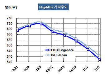 나프타(Naphtha)는 500달러대 중반으로 폭락세를 계속했다. 나프타 시세는 11월9일 C&F Japan 톤당 543달러로 51달러 폭락했고 FOB Singapore 역시 525달러로 55달러 폭락했다. CIF NWE는 521달러, FOB USG는 523달러로 내려앉았다. 표, 그래프: <Naphtha 가격추이> <화학저널 2018/11/16> |