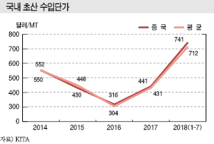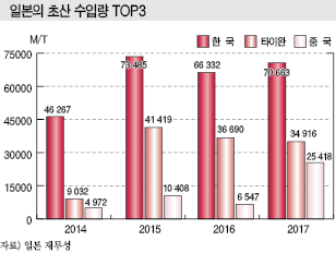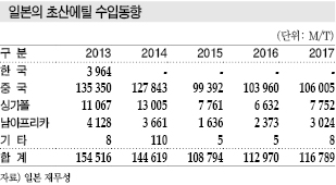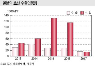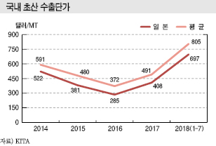 평균 수입단가는 2016년 톤당 3만5600엔에서 2017년 5만600엔으로 크게 상승했다. 한국산이 3만6100엔에서 5만1700엔, 타이완산이 3만3500엔에서 4만9900엔, 중국산이 3만7700엔에서 5만2500엔으로 올랐다.