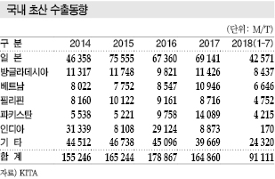 수출은 중국이 1만9355톤으로 3.3%, 한국이 8516톤으로 2.4% 줄어들어 총 9만366톤으로 4.3% 감소했다.