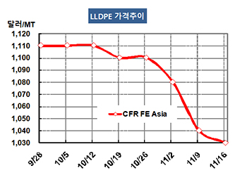 LLDPE(Linear Low-Density Polyethylene)는 폭락세를 멈추었다. LLDPE 시세는 11월14일 CFR FE Asia 톤당 1030달러로 10달러 하락했고 CFR SE Asia도 1090달러로 w0달러 떨어졌다. CFR S Asia 역시 1090달러로 10달러 하락했다. 표, 그래프: <LLDPE 가격추이> <화학저널 2018/11/19> |