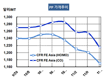 PP 시세는 11월14일 Raffia 및 Injection 그레이드 기준 CFR FE Asia 톤당 1170달러로 30달러 급락했고 CFR SE Asia는 1220달러로 20달러 하락했다. IPP Film 및 BOPP 역시 FEA가 1210달러 및 1200달러로 30달러 급락했고 SEA도 1240달러로 20달러 떨어졌다. Block Copolymer는 FEA가 1215달러로 40달러 폭락했고 SEA는 1260달러로 20달러 하락했다.