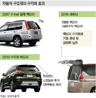 이에 따라 닛산자동차는 고장력강판, 알루미늄을 적용함과 동시에 플래스틱 채용을 확대하기 위한 기술 개발에 주력하고 있다.
