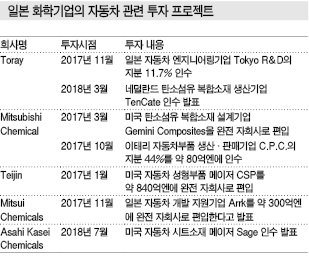 일본 화학기업들은 유럽 및 미국 자동차기업에 접근하기 위해 자동차 관련 대규모 인수합병(M&A)을 잇따라 추진하고 있다.