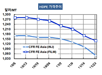 HDPE 시세는 11월21일 인젝션(Injection) 그레이드가 CFR FE Asia 톤당 1050달러로 50달러 폭락했고 CFR SE Asia도 1070달러로 60달러 폭락했다. 블로우 몰딩(Blow-Molding)도 FEA는 1145달러로 55달러, SEA는 1165달러로 65달러 폭락했다. 필름(Film)은 FEA는 1140달러로 30달러 급락했고 SEA는 1160달러로 50달러 폭락했다.