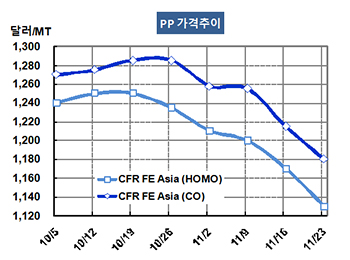 PP(Polypropylene)는 하락폭이 점점 커지고 있다. PP 시세는 11월21일 Raffia 및 Injection 그레이드가 CFR FE Asia 톤당 1130달러 및 1125달러로 40달러 및 45달러 폭락했고 CFR SE Asia는 1160달러로 60달러 대폭락했다. IPP Film은 FEA가 1150달러로 60달러, SEA도 1180달러로 60달러 대폭락했고, BOPP는 FEA가 1160달러로 40달러, SEA는 1190달러로 50달러 폭락했다. Bock Copolymer 역시 FEA는 1180달러로 35달러 급락했고 SEA는 1200달러로 60달러 대폭락했다. 표, 그래프: <PP 가격추이> <화학저널 2018/11/27> |