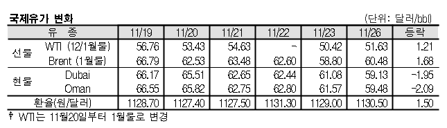 11월26일 국제유가는 위험자산 투자심리 개선, 골드만삭스의 원료가격 반등 전망 등의 영향으로 상승했다.