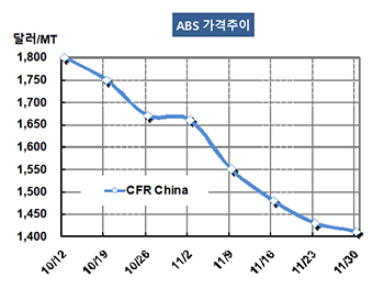 ABS(Acrylonitrile Butadiene Styrene)는 1400달러가 위험해지고 있다. ABS 시세는 11월28일 CFR China 톤당 1410달러로 20달러 하락했고 CFR SE Asia도 1460달러로 20달러 떨어졌다. 표, 그래프: <ABS 가격추이> <화학저널 2018/12/05> |