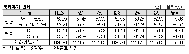 12월5일 국제유가는 미국 도널드 트럼프 대통령의 감산 반대, 미국의 원유 재고 증가 추정, 미국 달러화 강세 등의 영향으로 하락했다. 12월5일 국제유가는 미국 도널드 트럼프 대통령이 감산에 반대한 영향으로 하락했다. 표, 그래프: <국제유가 변화> <화학저널 2018/12/06> |