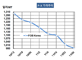 P-X(Para-Xylene)는 1000달러가 붕괴됐다. P-X 시세는 11월30일 FOB Korea 톤당 983달러로 33달러 하락했고 CFR SE Asia 역시 991달러로 32달러 떨어졌다. CFR China는 33달러 하락했으나 1003달러로 1000달러를 간신히 유지했다. 표, 그래프: <P-X 가격추이> <화학저널 2018/12/06> |