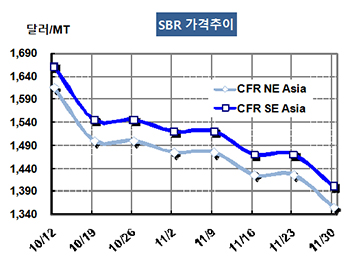 SBR(Styrene Butadiene Rubber)은 또다시 폭락했다. SBR 시세는 11월28일 CFR China 톤당 1355달러로 70달러 폭락했고 CFR SE Asia도 1400달러로 70달러 폭락했다. 표, 그래프: <SBR 가격추이> <화학저널 2018/12/07> |