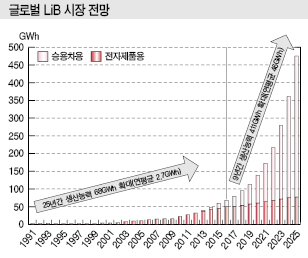 휴대전화, 노트북에도 투입되고 있는 LiB는 1991년 시장이 형성되기 시작했으며 2016년 자동차용을 포함한 글로벌 시장규모가 68GWh, 약 26조원으로 성장했다.