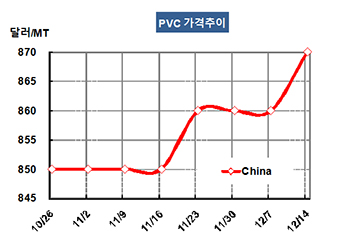 PVC 시세는 12월12일 CFR China 톤당 870달러로 10달러 상승했고 CFR SE Asia도 870달러로 10달러 올랐다. 특히, CFR India는 930달러로 20달러 상승했다.