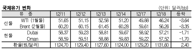 12월18일 국제유가는 공급과잉 우려 지속, 산유국 감산 미개시, 2019년 세계경제 성장세 위축 전망 등의 영향으로 폭락했다. 12월18일 국제유가는 공급과잉 우려가 지속되면서 큰 폭으로 하락했다. 표, 그래프: <국제유가 변화> <화학저널 2018/12/19> |