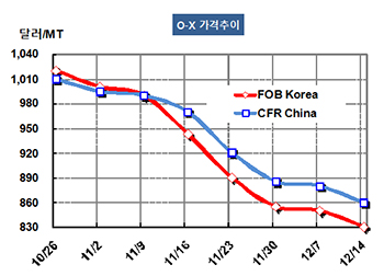 O-X(Ortho-Xylene)는 800달러대 초반으로 떨어졌다. O-X 시세는 12월14일 FOB Korea 톤당 830달러로 20달러 하락했고 CFR SE Asia도 875달러로 20달러 떨어졌다. CFR China는 20달러 하락해 860달러를 형성했다. 표, 그래프: <O-X 가격추이> <화학저널 2018/12/19> |