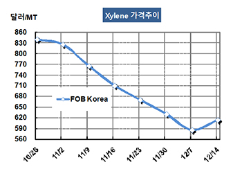 M-X(Mixed-Xylene)는 상승과 하락이 엇갈렸다. M-X 시세는 12월14일 솔벤트(Solvent) 그레이드 기준 FOB Korea 톤당 613달러로 28달러 상승했으나 CFR SE Asia는 690달러로 23달러 하락했다. CFR China는 633달러로 13달러 올랐고 CFR India는 698달러로 33달러 상승했다. 표, 그래프: <Xylene 가격추이> <화학저널 2018/12/19> |
