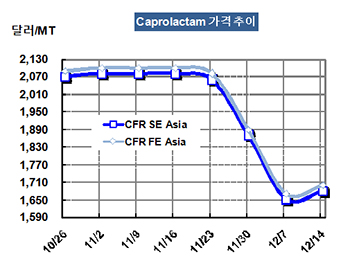 CPL(Caprolactam)은 상승세로 전환됐다. CPL 시세는 12월14일 CFR FE Asia 톤당 1700달러로 30달러 상승했고 CFR SE Asia도 1680달러로 30달러 올랐다. 표, 그래프: <Caprolactam 가격추이> <화학저널 2018/12/20> |