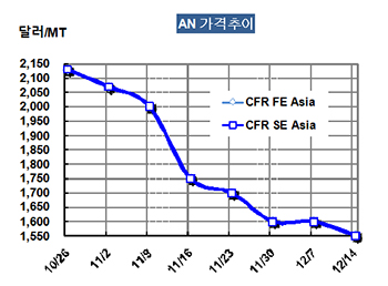 AN(Acrylonitrile)은 나락으로 떨어지고 있다. AN 시세는 12월14일 CFR FE Asia 톤당 1550달러로 50달러 급락했고 CFR SE Asia도 1550달러로 50달러 급락했다. CFR S Asia 역시 50달러 급락해 1520달러를 형성했다. 표, 그래프: <AN 가격추이> <화학저널 2018/12/20> |