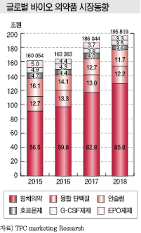 바이오 의약품 종류별로는 항체의약품이 116조8100억원으로 전체의 62.8%를 차지했고 휴미라, 항암제인 아바스틴(Avastin)과 헤르셉틴(Herceptin), 케이트루다 등 암 면역제제가 성장을 견인했다.