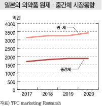 TPC Marketing Research에 따르면, 일본은 의약품 원제·중간체 시장이 2017년 4698억엔(4조6980억원)으로 2016년에 비해 4% 성장했으며 2020년까지 연평균 3.8% 성장해 5227억엔(약 5조2270억원)에 달할 것으로 예측되고 있다.