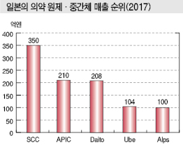 일본 의약품 원제·중간체 시장은 2019년 5000억엔(약 5조원) 이상으로 2017년에 비해 8.5% 확대될 것으로 예상되고 있다.