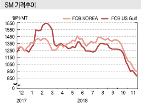 SM은 봄철 집중 정기보수가 마무리됐음에도 불구하고 7월 말부터 10월 초까지 1400달러 수준을 유지했고 8월에는 1500달러를 돌파했으나 10월 중순 이후 급락 및 폭락세를 이어가 900달러가 무너지기 직전으로 내몰리고 있다.