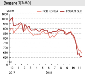 벤젠 가격은 나프타 가격 하락, 다운스트림 가동률 저하 영향으로 최근 2개월 사이에 300달러 정도 폭락했으며 11월 말에는 600달러가 붕괴됐다.