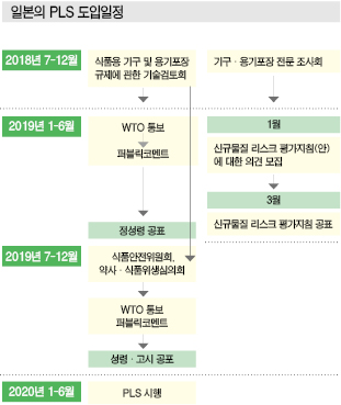 일본은 2020년 4-6월 PLS를 본격 시행하기에 앞서 2019년 봄 세계무역기구(WTO)에 대한 통보 및 퍼블릭 코멘트를 실시할 예정이다.
