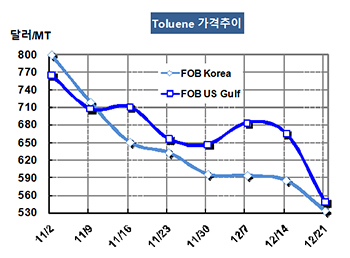 톨루엔(Toluene)은 500달러대 초반으로 폭락했다. 톨루엔 시세는 12월21일 FOB Korea 톤당 533달러로 52달러 폭락했고 FOB SE Asia는 534달러로 52달러 폭락했다. CFR Taiwan도 556달러로 52달러 폭락했고 CFR India 역시 588달러로 52달러 폭락했다. 표, 그래프: <Toluene 가격추이> <화학저널 2018/12/26> |