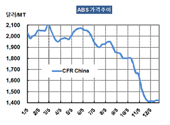 ABS(Acrylonitrile Butadiene Styrene)는 초강세가 막을 내렸다. ABS 시세는 2018년 12월26일 CFR China 톤당 1420달러로 변동이 없었고 CFR SE Asia도 1400달러대를 형성했다. 표, 그래프: <ABS 가격추이> <화학저널 2019/01/02> |