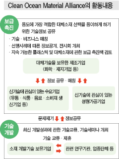 일본, 폐플래스틱 문제 해결 위해 제휴 … 성형·수요기업 참여 일본이 해양 플래스틱 문제에 적극 대응하고 있다. 표, 그래프: <Clean Ocean Material Alliance의 활동내용> <화학저널 2019년 1월 7일> |
