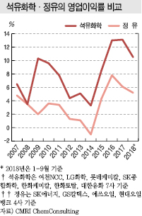 2018년 1-9월에도 정유4사는 매출액 86조7585억원, 영업이익 4조4971억원으로 영업이익률이 5.2%에 그쳤으나 석유화학 7사는 매출액 63조7350억원, 영업이익 6조6744억원으로 영업이익률이 10.5%로 정유4사의 2배를 넘었다.