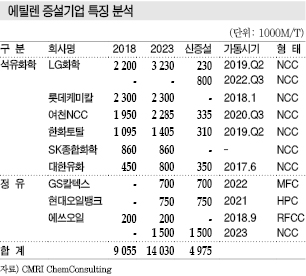 국내 에틸렌 생산능력은 2017년 865만톤에서 2023년 1403만톤으로 크게 확대되고 생산기업도 석유화학 6사에 정유 3사를 포함 9사로 늘어나게 된다.