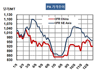 PA는 2018년 1월 1000달러 수준에서 출발해 7-8월 800달러 초반으로 미끄러졌으나 O-X(Ortho-Xylene) 강세를 타고 말부터 오르기 시작해 10월에는 900달러를 돌파했고 연말에는 O-X가 약세로 전환됐음에도 불구하고 900달러대 호조를 계속했다.