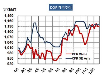 DOP는 메이저들이 가동률을 낮추고 PVC(Polyvinyl Chloride)가 강세로 전환됐음에도 불구하고 CFR China 1060달러로 20달러 하락했다.