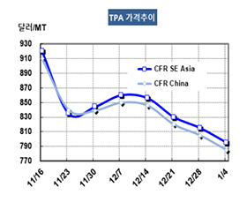국제유가가 브렌트유(Brent) 기준 배럴당 56.69달러로 2.55달러 급등함에 따라 원료 P-X(Para-Xylene) 현물가격이 1월4일 FOB Korea 톤당 951달러로 23달러 상승했으나 1월2일에는 CFR Taiwan 928달러로 39달러 급락했기 때문이다.