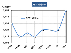 ABS(Acrylonitrile Butadiene Styrene)는 상승세로 전환됐다. ABS 시세는 1월9일 CFR China 톤당 1450달러로 30달러 급등했고 CFR SE Asia는 1490달러로 30달러 올랐다. 표, 그래프: <ABS 가격추이> <화학저널 2019/01/16> |