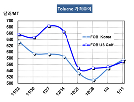 톨루엔(Toluene)은 500달러대 후반으로 상승했다. 톨루엔 시세는 1월11일 FOB Korea 톤당 576달러로 28달러 상승했고 FOB SE Asia 역시 577달러로 28달러 올랐다. 표, 그래프: <Toluene 가격추이> <화학저널 2019/01/16> |