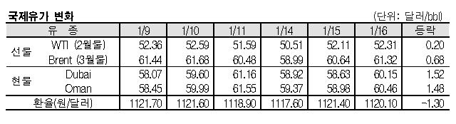 1월16일 국제유가는 위험자산에 대한 투자심리 개선, 러시아의 감산 이행 발언 등의 영향으로 상승했다. 1월16일 국제유가는 위험자산에 대한 투자심리가 개선된 영향으로 상승했다. 표, 그래프: <국제유가 변화> <화학저널 2019/01/17> |