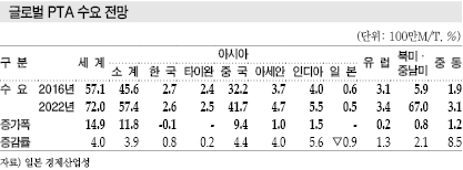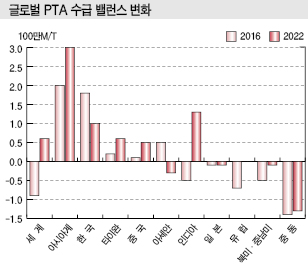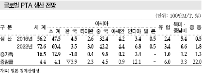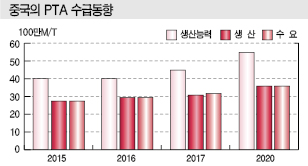 PTA는 글로벌 수요가 2016년 5710만톤에서 2022년 7200만톤으로 4.4% 늘어나지만 생산능력이 6930만톤에서 9430만톤으로 5.3% 확대되며 수급이 수요초과에서 오히려 공급과잉으로 전환될 가능성이 제기되고 있다.