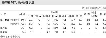 일본 경제산업성이 공표한 세계 석유화학제품 수급동향에 따르면, 글로벌 PTA 생산량 및 수요는 모두 중국이 절반 이상을 차지하고 있으며 중국비중이 날로 확대되고 있다.