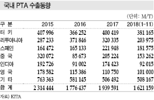 중국은 PTA 생산량이 증가하면서 한때 700만톤에 달하던 수입량이 2016년과 2017년에는 50만톤 수준으로 격감했다.