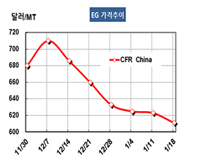 MEG 시세는 1월18일 CFR China 톤당 611달러로 12달러 하락했고 CFR SE Asia도 611달러로 12달러 떨어졌다.
