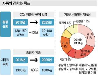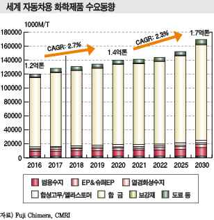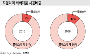 글로벌 자동차용 화학제품 수요는 2016년 1억4000만톤에 달했으나 플래스틱은 9%에 불과한 것으로 나타나고 있다.