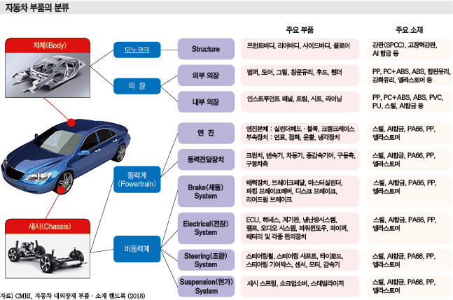 글로벌 xEV 수요 증가는 언더후드 소재의 전환을 견인하고 운전자의 편의성, 안전성을 높이는 노력은 전장, 내외장재, 새시의 개발 트렌드를 좌우하고 있다.