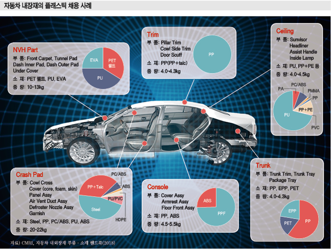 화학경제연구원(CMRI)이 2018년 11월 발간한 자동차 내외장재 부품·소재 핸드북에 따르면, 중형 자동차 내장재에 채용되는 플래스틱은 PP가 20kg으로 가장 많았고 PU가 8kg으로 뒤를 이었다.