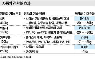 표, 그래프: <세계 자동차용 화학제품 수요동향, 자동차 부품의 분류, 자동차 경량화 효과, 자동차 내장재의 플래스틱 채용 사례, 자동차의 화학제품 사용비중, 자동차용 플래스틱 사용비중 변화,자동차용 경량화 목표>
