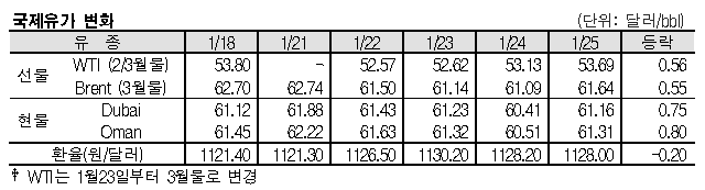 1월25일 국제유가는 베네주엘라의 정정불안 심화, 미국 달러화 약세 등의 영향으로 상승했다.