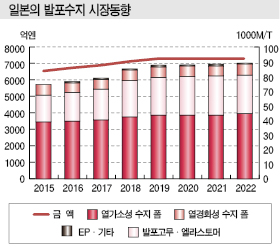 Fuji Chimera에 따르면, 열경화성 수지 폼은 2018년 원료가격 급등에 따른 단가 상승 등으로 일본 시장이 6604억엔으로 전년대비 8.1% 성장한 것으로 추정된다.